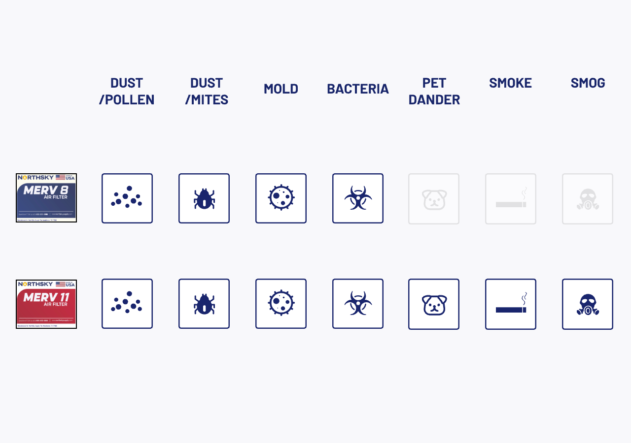 MERV 8: Suitable for residential homes, commercial and industrial buildings, and work spaces.