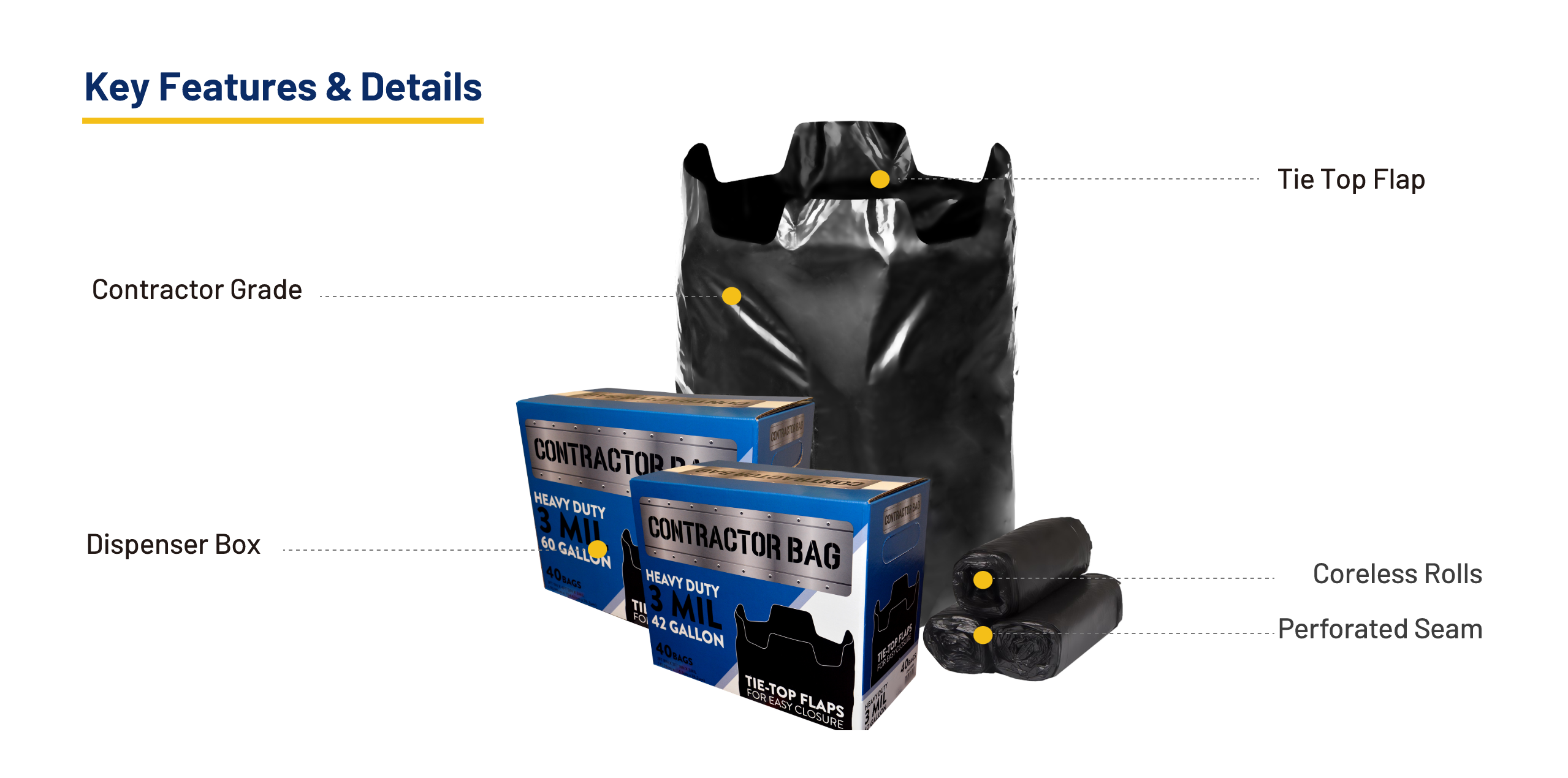 Flap tie top aids in quick and secure closure of this heavy weight trash bag, while offering a secure handle for carrying and removal.