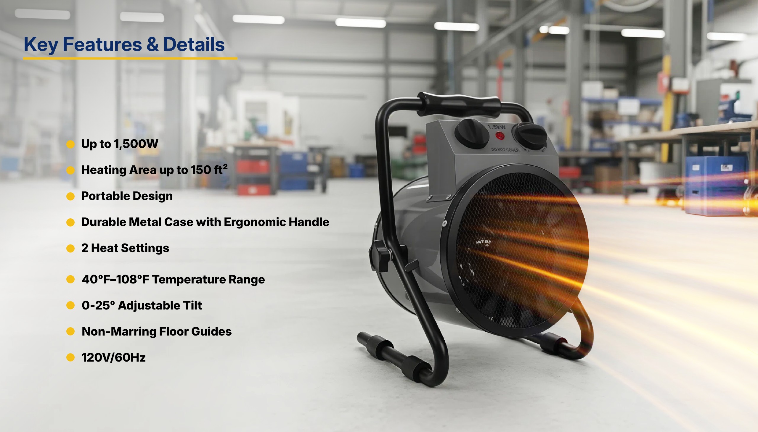 Ideal for spot heating in garages, workshops, warehouses, or shop floors—providing localized warmth efficiently and conveniently.