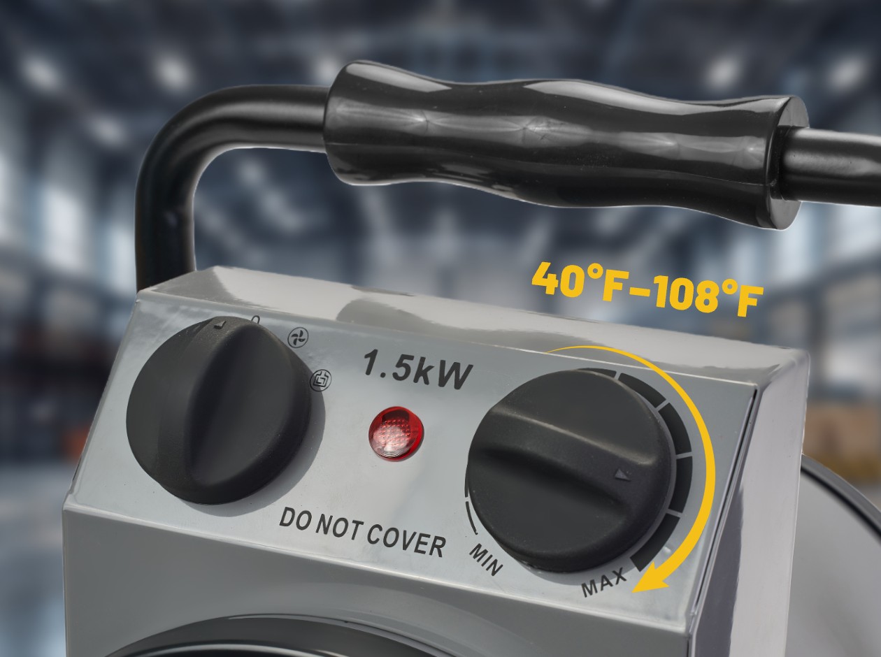 Equipped with a dual-function control knob for fan-only or high heat operation, along with a 40°F–108°F adjustable thermostat dial to ensure rapid, personalized warmth.