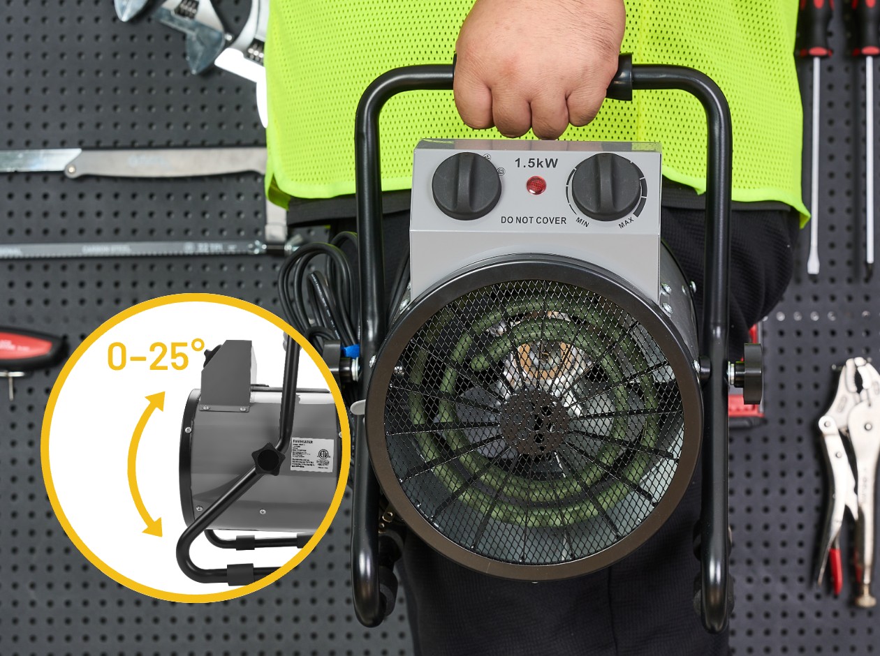 A built-in 0–25° tilt adjustment knob allows precise directional heat targeting, while the uniquely designed air duct delivers airflow across longer distances for broader and more effective coverage.
