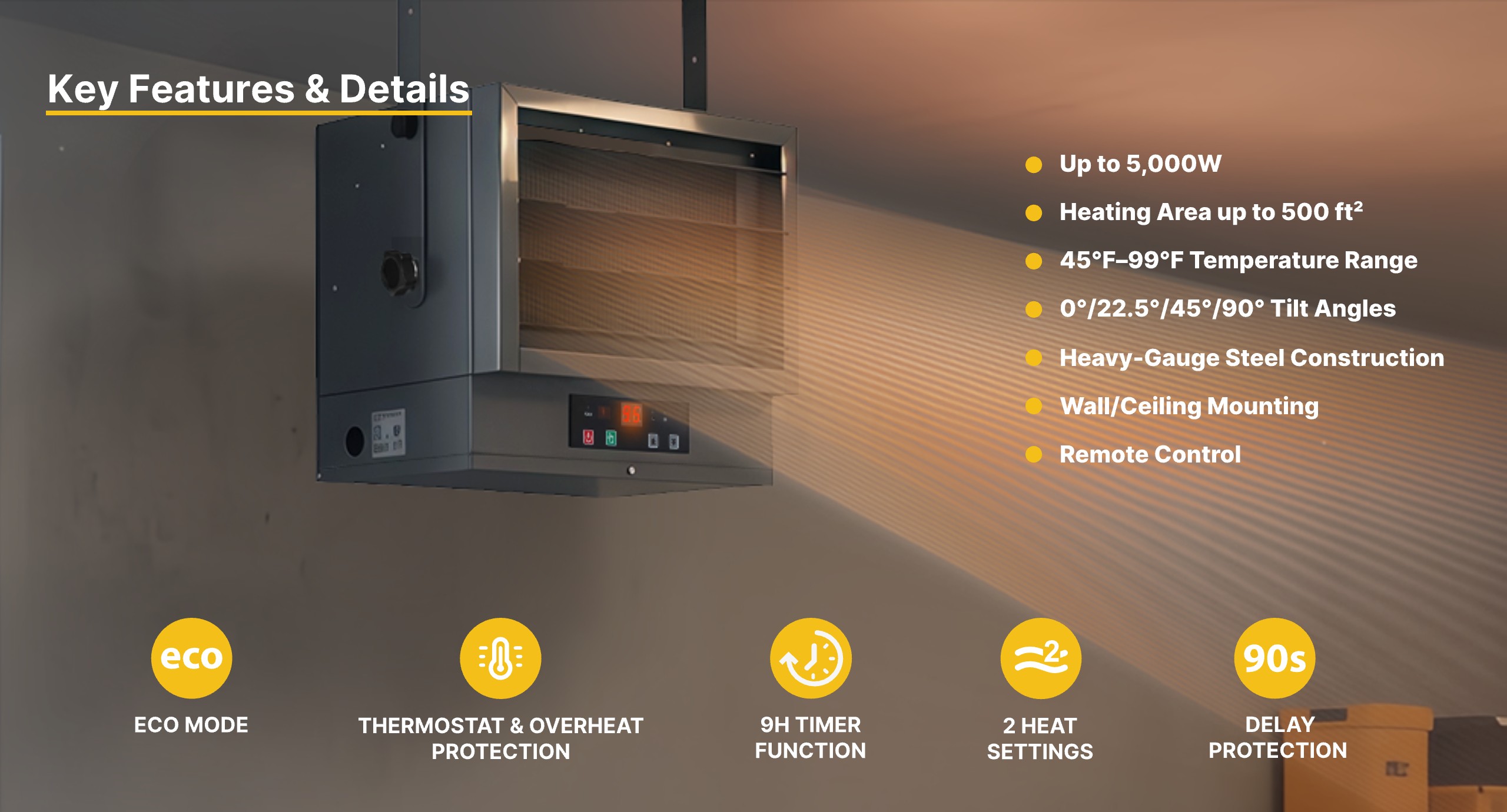 Fan-forced design with adjustable louvers and tilt angles (0°/22.5°/45°/90°) spreads warmth evenly up to 500 ft². The adjustable design enables secure and stable mounting on both wall and ceiling, allowing precise directional control of airflow to optimize heating efficiency.