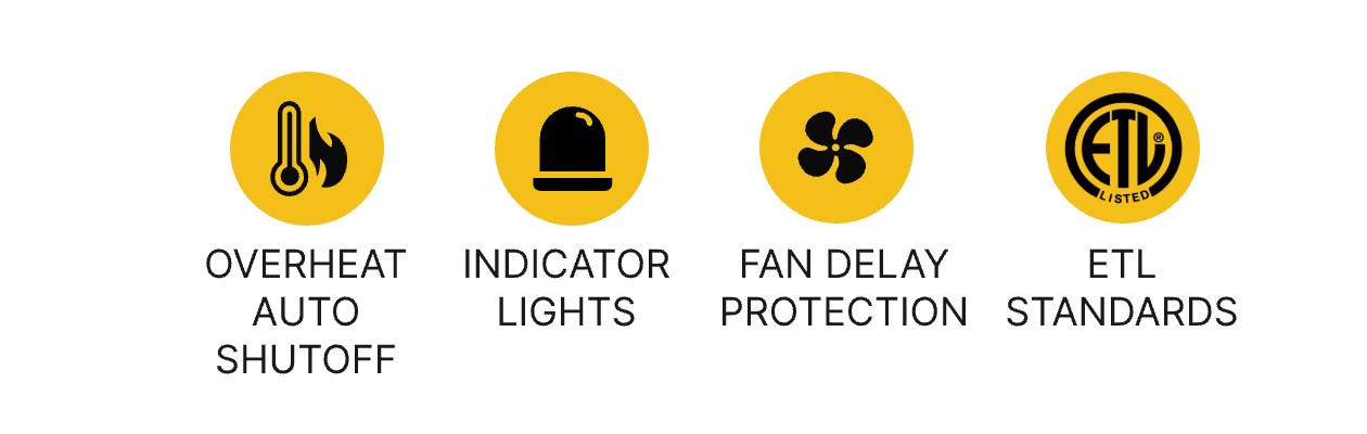 Equipped with overheat auto shutoff, fan delay protection, and indicator lights for enhanced operational safety. Includes abnormal error code display and warning alarm system for early fault detection. ETL certified to meet U.S. safety standards.