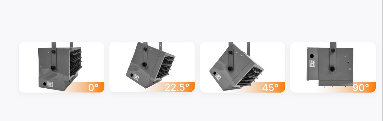 Fan-forced design with adjustable louvers and tilt angles (0°/22.5°/45°/90°) spreads warmth evenly up to 640 ft². The adjustable design enables secure and stable mounting on both wall and ceiling, allowing precise directional control of airflow to optimize heating efficiency.